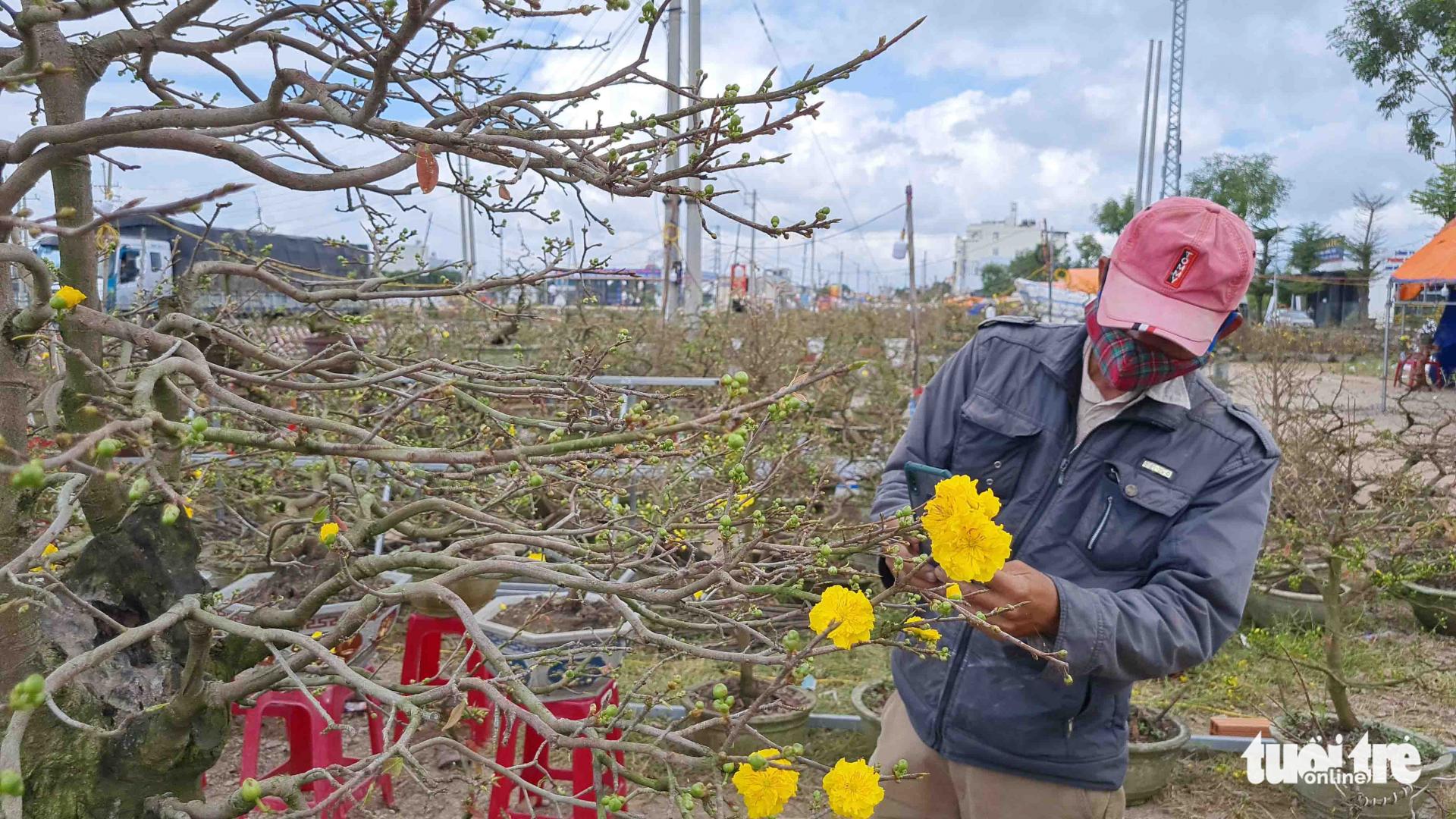 Anh Nguyễn Văn Đức (một chủ vườn mai tại thị xã An Nhơn, Bình Định) phát trực tiếp hình ảnh vườn mai nhà mình lên mạng xã hội để giới thiệu cho người mua - Ảnh: LÂM THIÊN