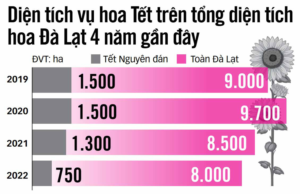 Nếu như 2 năm trước, để phục vụ thị trường Tết, vùng hoa Đà Lạt (gồm Đà Lạt và các huyện lân cận) xuống giống khoảng 1.500ha với đủ chủng loại thì năm nay tổng diện tích xuống giống chỉ 50%, đạt khoảng 750ha.